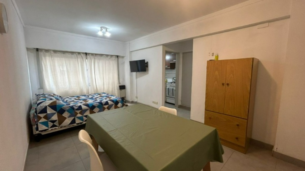 El ambiente principal cuenta con mesa con sillas y somier matrimonial nuevo, al igual que las almohadas. Dispone de cocina separada equipada, baño completo y espacio de guardado, brindando comodidad y funcionalidad para una estadía práctica.